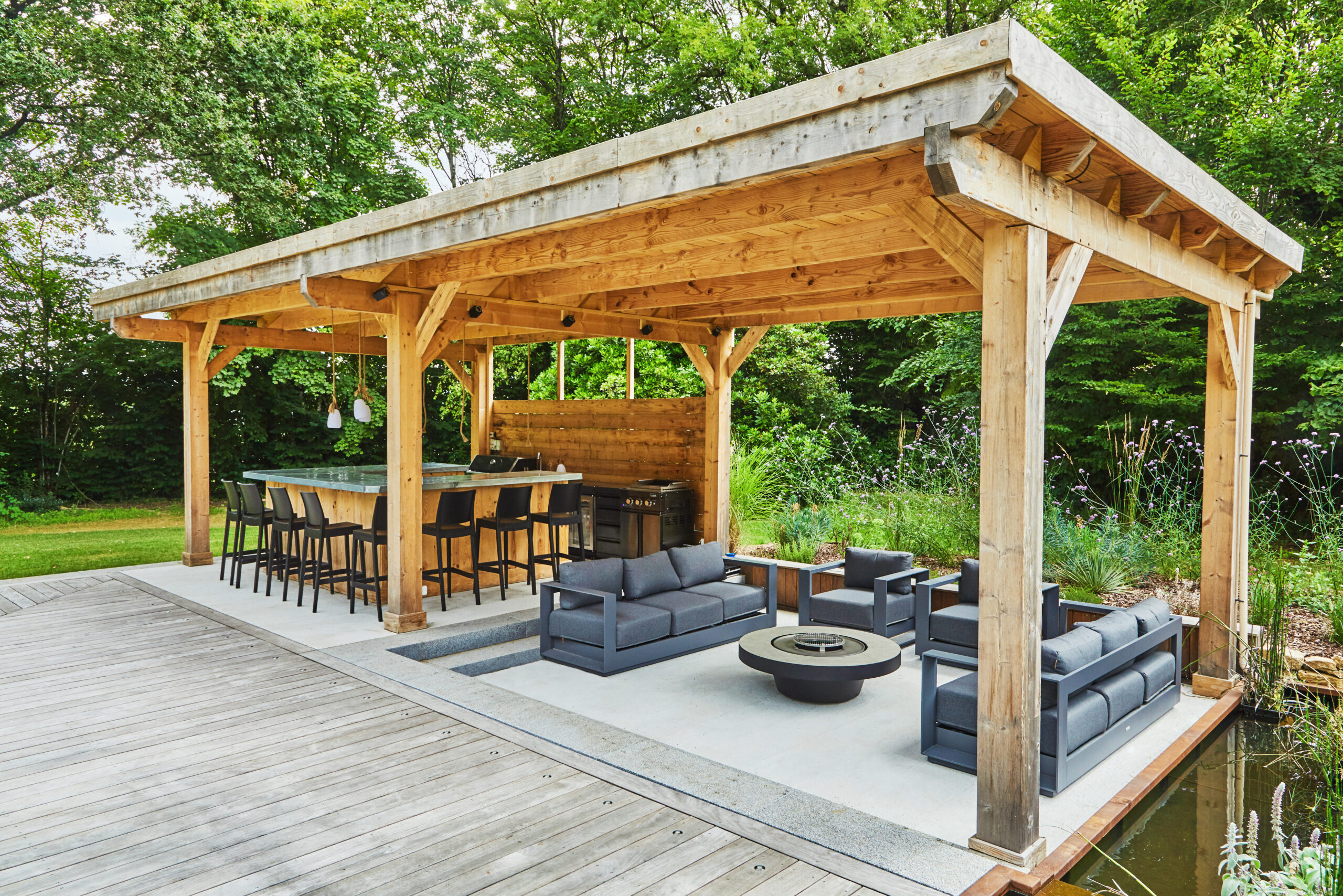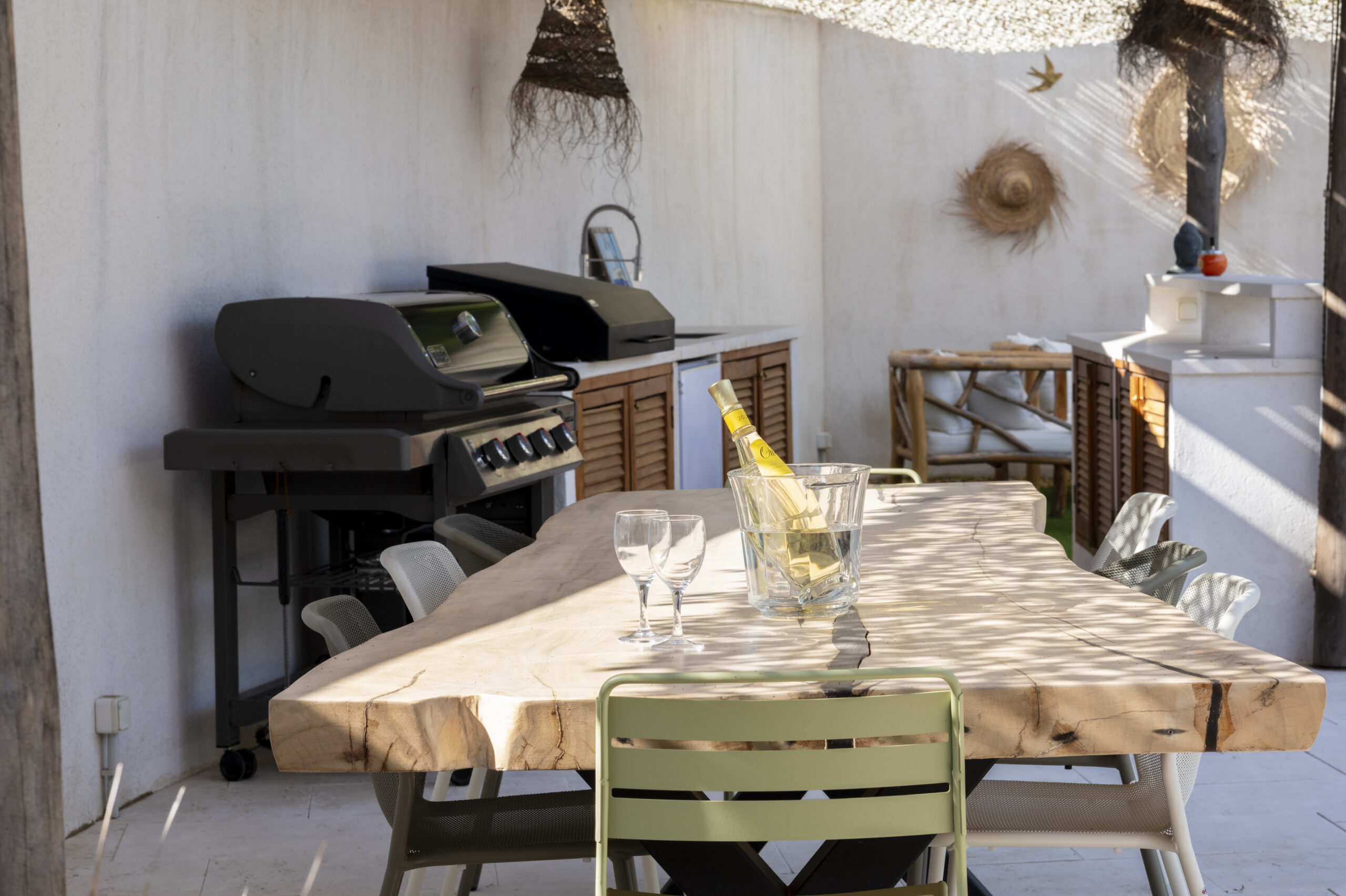 La cuisine extérieure devient un véritable point central autour duquel s’organise la vie de la terrasse.