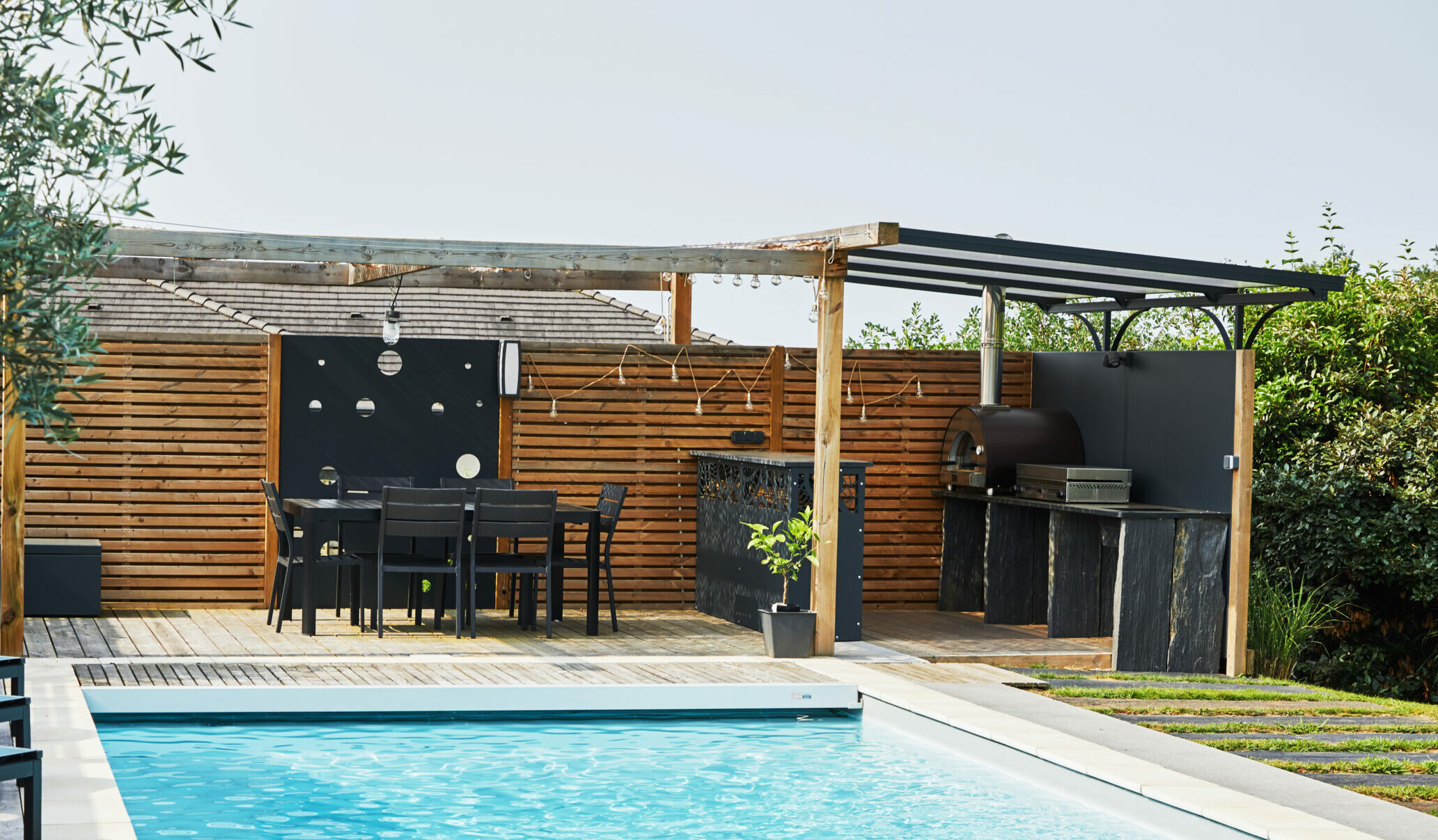 Le four à pizza apporte immédiatement une dimension chaleureuse à la terrasse.